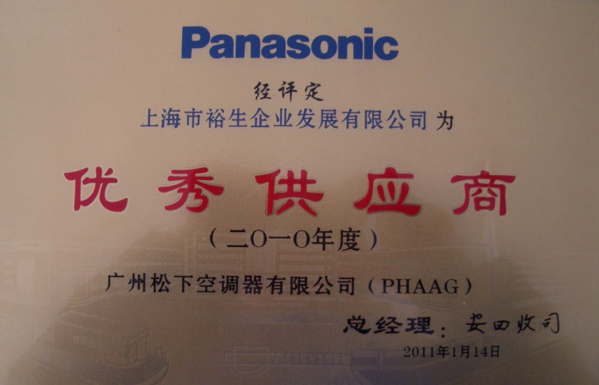 二0一一年一月十四日消息:经Panasonic评定,上海裕生企业发展有限公司为广州松下空调器有限公司优秀供应商。